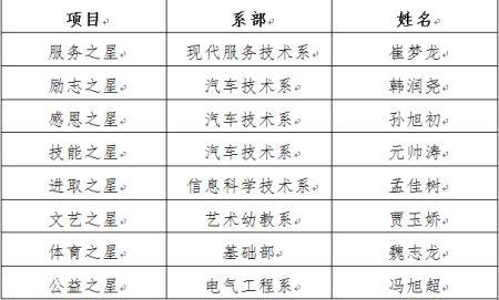 在学生中寻榜样,于学生中立新星。为进一步创建优良校风,增强榜样教育,树立学生典型,院团委联合学保处于近期组织各系部团总支开展了2020年度“校园之星”评选活动。